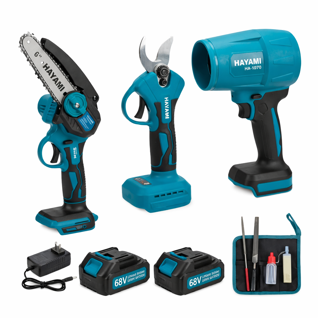 HAYAMI HA-1070 3 az 1-ben akkumulátoros kerti szerszámkészlet 68V rendszerrel. Mini láncfűrész, metszőolló és lombfúvó egy szettben.