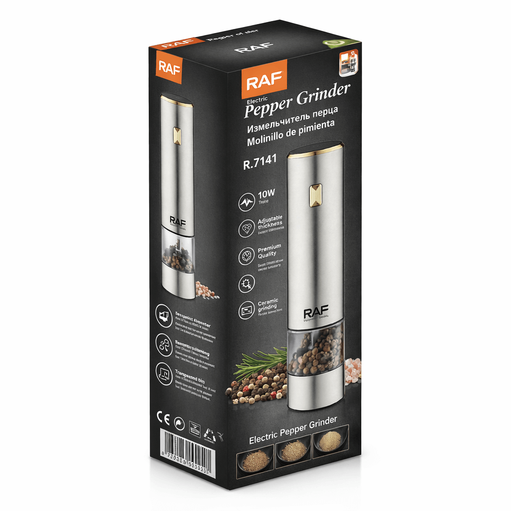 A RAF R.7141 elektromos borsőrlő elegáns, modern megjelenésével és megbízható teljesítményével tökéletes választás minden konyhába. A rozsdamentes acél ház prémium hatást kelt, míg az átlátszó tartály lehetővé teszi a fűszerszint egyszerű ellenőrzését.
