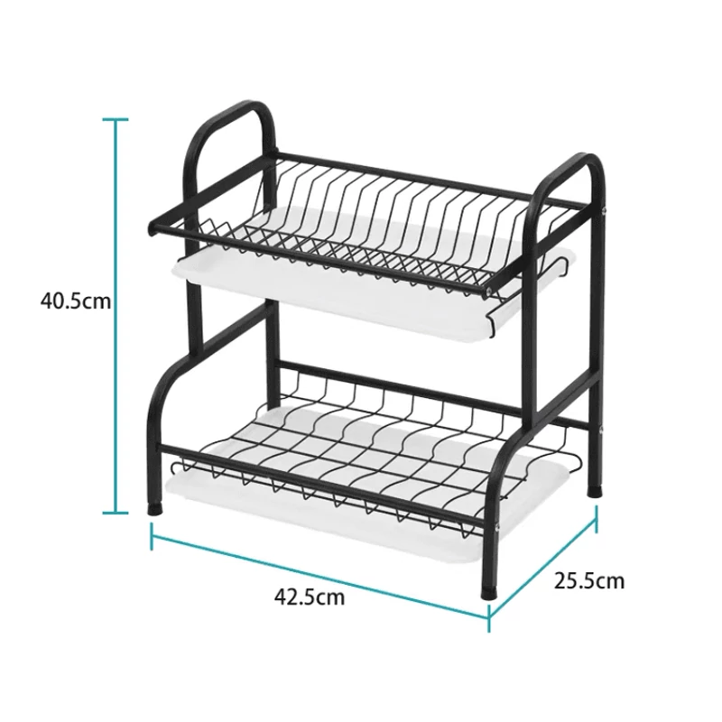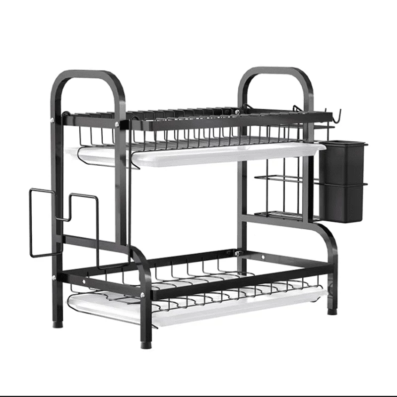 kétemeletes edényszárító, konyhai edényszárító polc, fémvázas edényszárító, csepegtető tálcás edényszárító, fekete edényszárító, konyhai polc edényekhez, helytakarékos edényszárító, evőeszköztartós edényszárító, modern konyhai szárító.