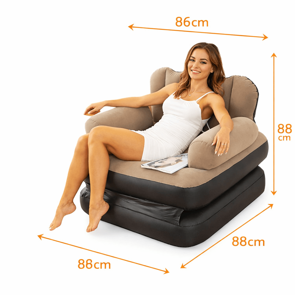Élvezd a maximális kényelmet ezzel a 2 az 1-ben felfújható fotel és nyugágy kombinációval! Praktikus kialakításának köszönhetően pillanatok alatt átalakítható kényelmes fotellé vagy teljes hosszúságú pihenő nyugággyá. Ideális választás otthonra, teraszra, kertbe, strandra vagy akár medence mellé.