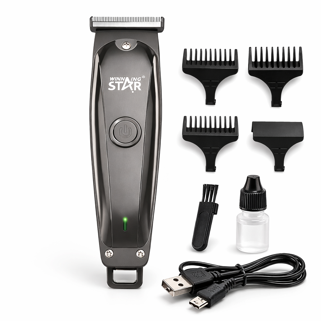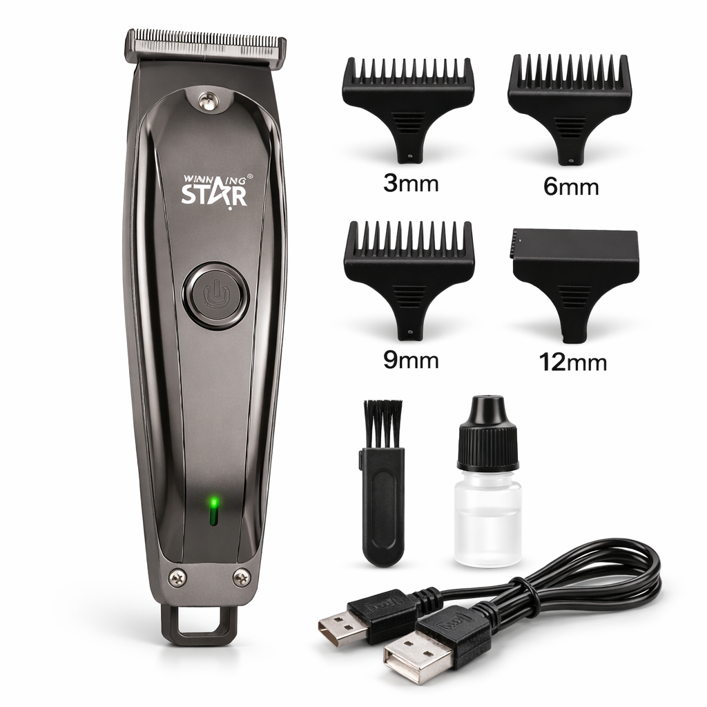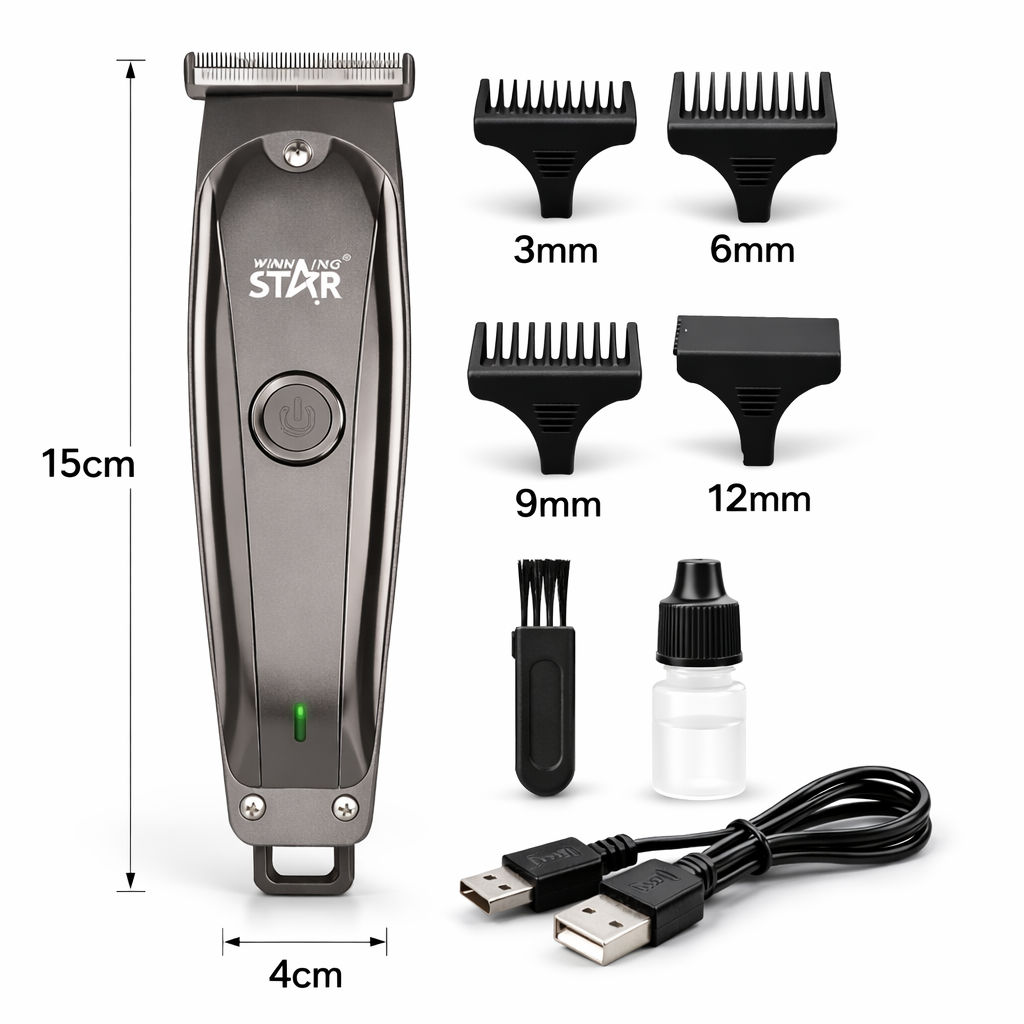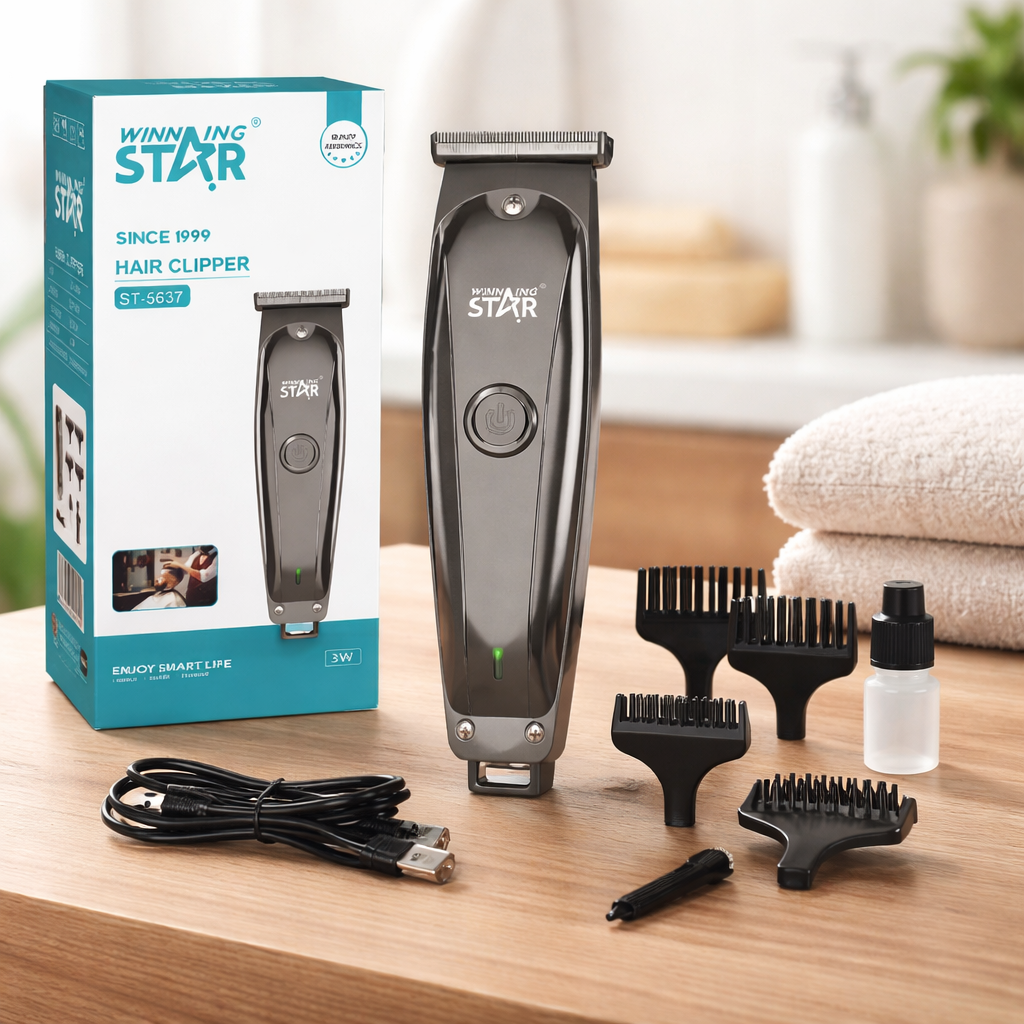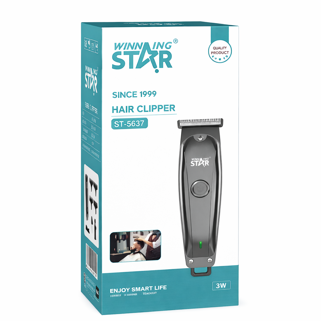 Winning Star ST-5637 hajvágó gép vezeték nélküli kivitelben, USB töltéssel és többféle vágófejjel. Kompakt, 3W teljesítményű hajnyíró otthoni hajvágáshoz és szakállformázáshoz. Precíz pengék, ergonomikus kialakítás, könnyű tisztítás.