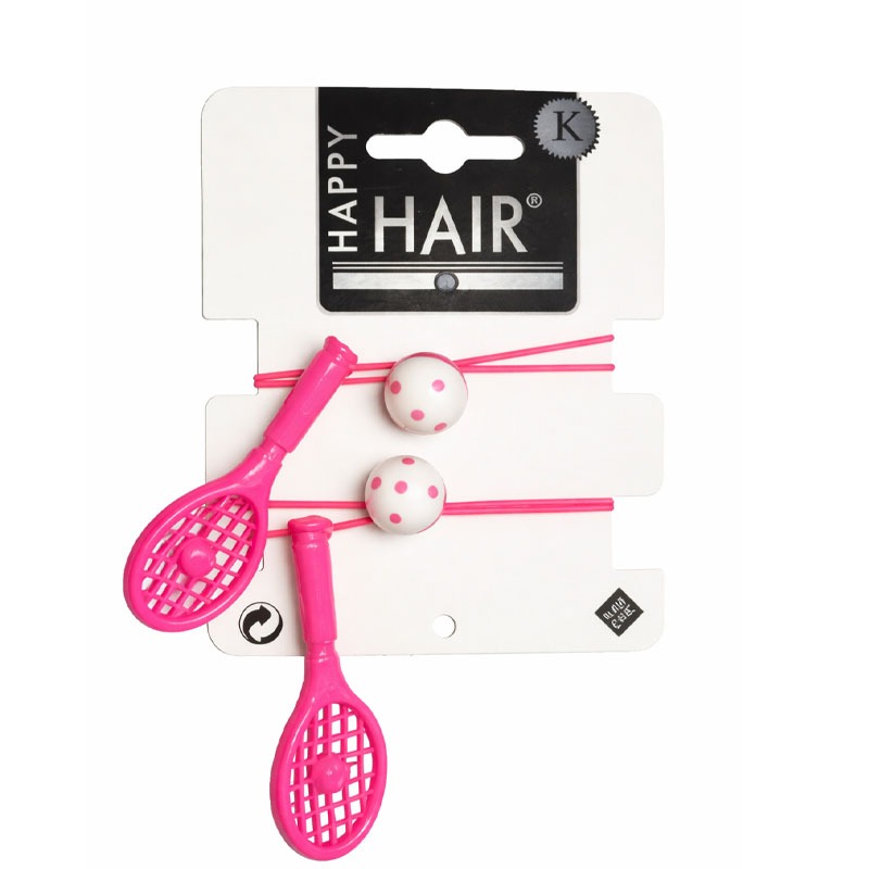 Vidám, sportos megjelenésű Happy Hair hajgumi szett, teniszütő és labda díszítéssel. A rugalmas hajgumik kényelmesen tartják a hajat, miközben játékos kiegészítőként feldobják a frizurát.