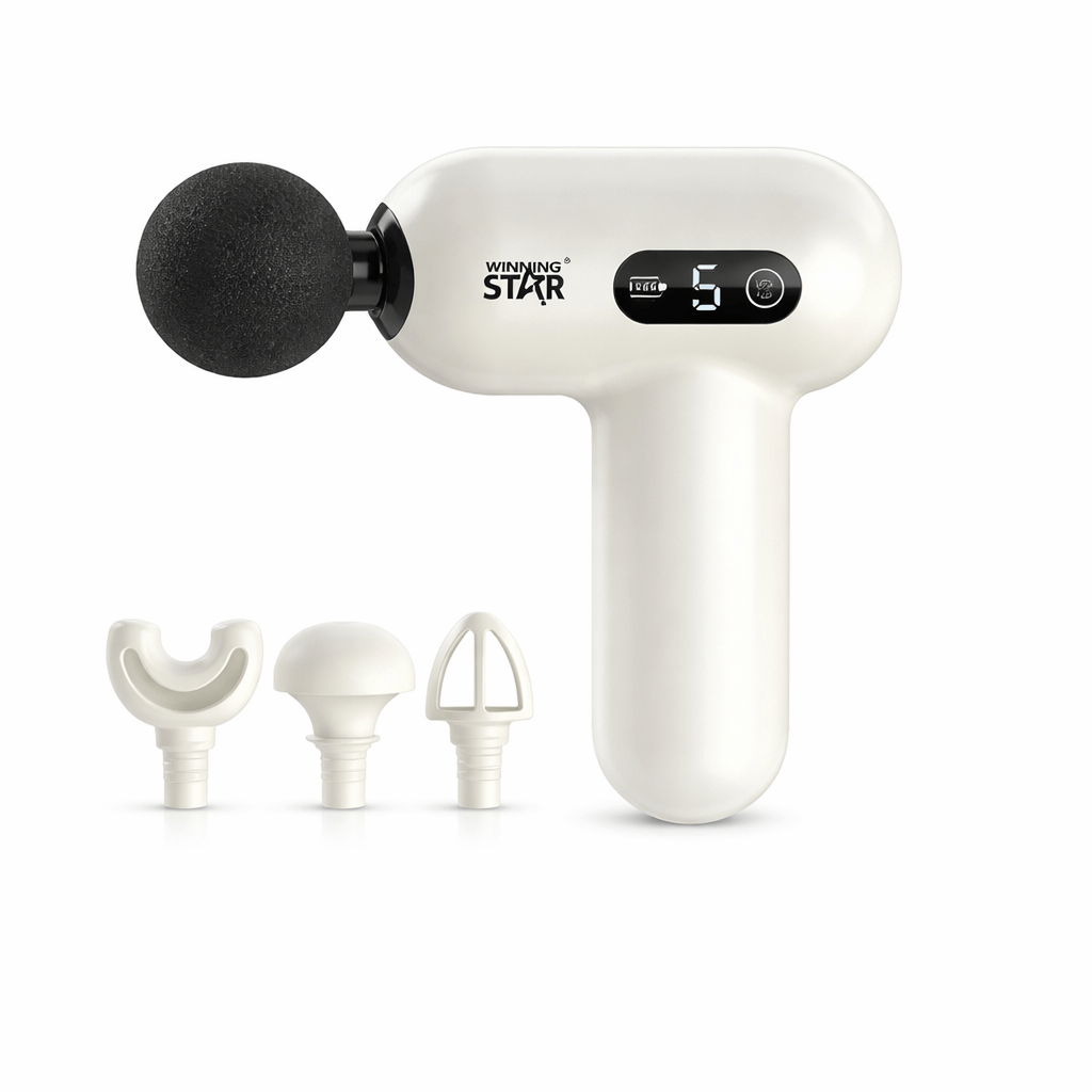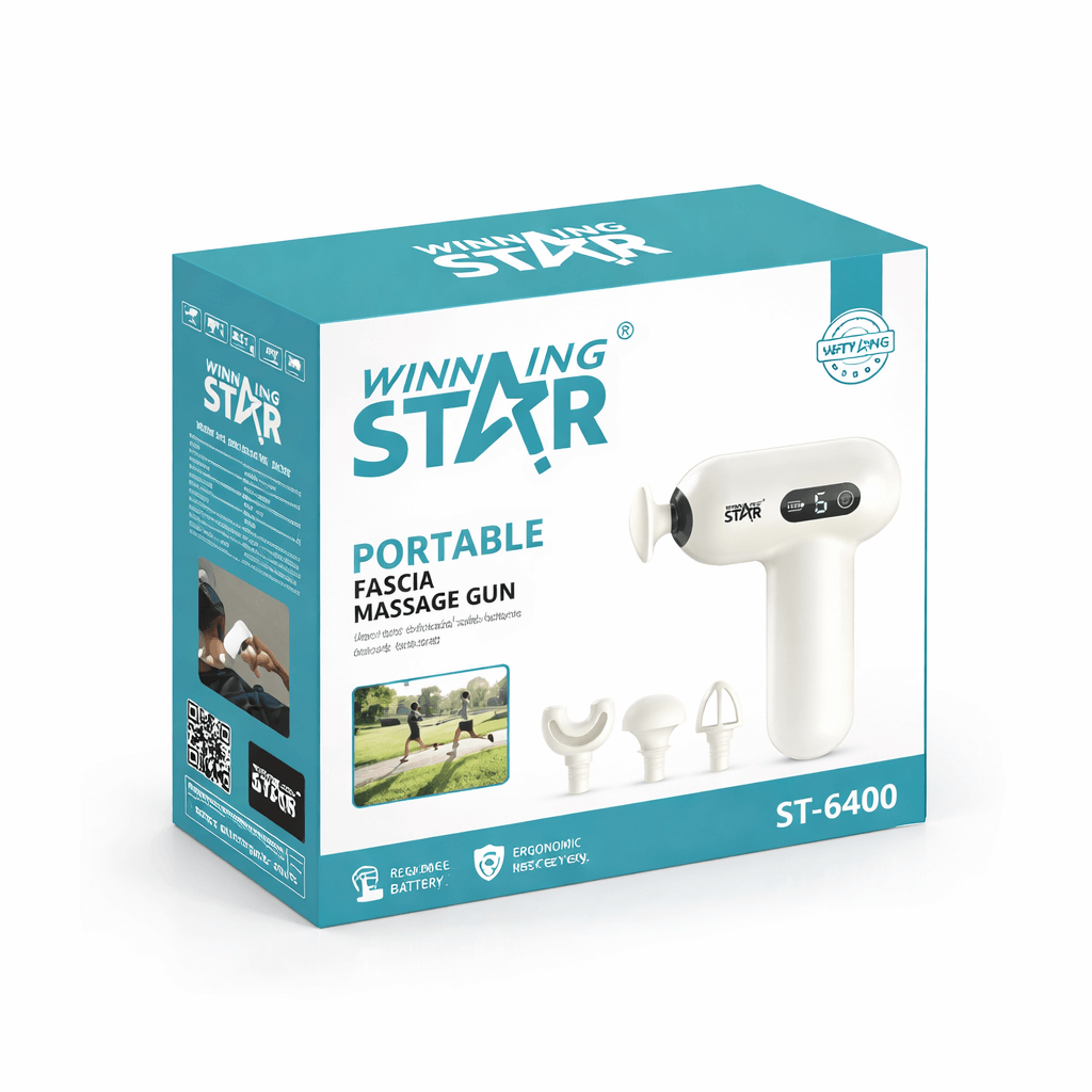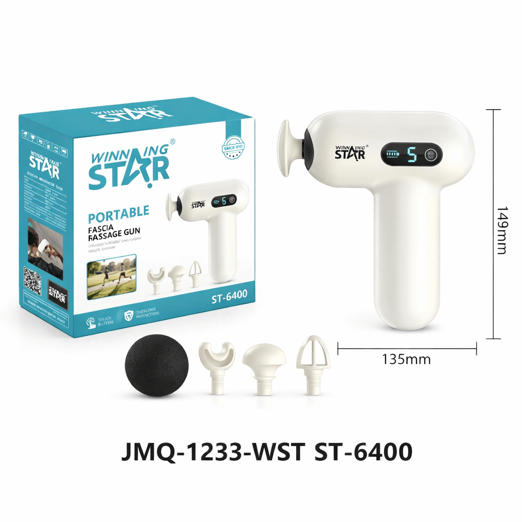 A Winning Star ST-6400 hordozható fascia masszázspisztoly ideális választás edzés utáni regenerációhoz, izomfeszültség csökkentésére és mindennapi relaxációhoz. Kompakt méretének (135 × 149 mm) köszönhetően könnyen hordozható, mégis hatékony mélyizom-masszázst biztosít.