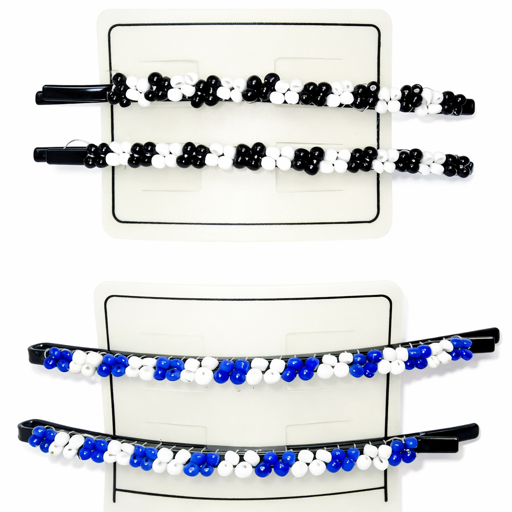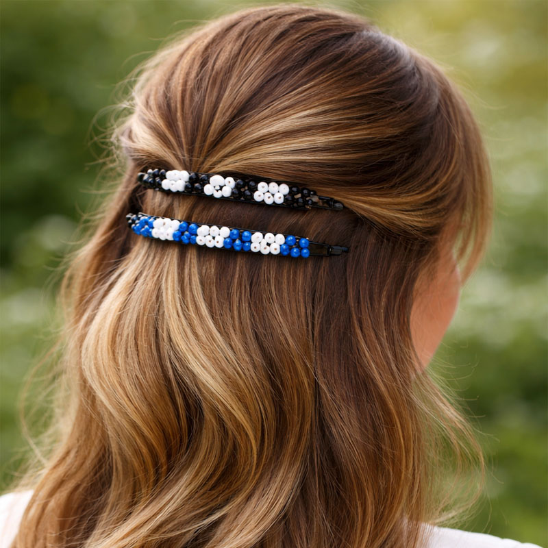Elegáns és divatos gyöngyös női hajcsat, amely tökéletes kiegészítője a mindennapi és alkalmi frizuráknak. A fekete-fehér, illetve kék-fehér színkombinációjú díszes hajcsipesz stílusos megjelenést biztosít, miközben stabilan tartja a hajat.