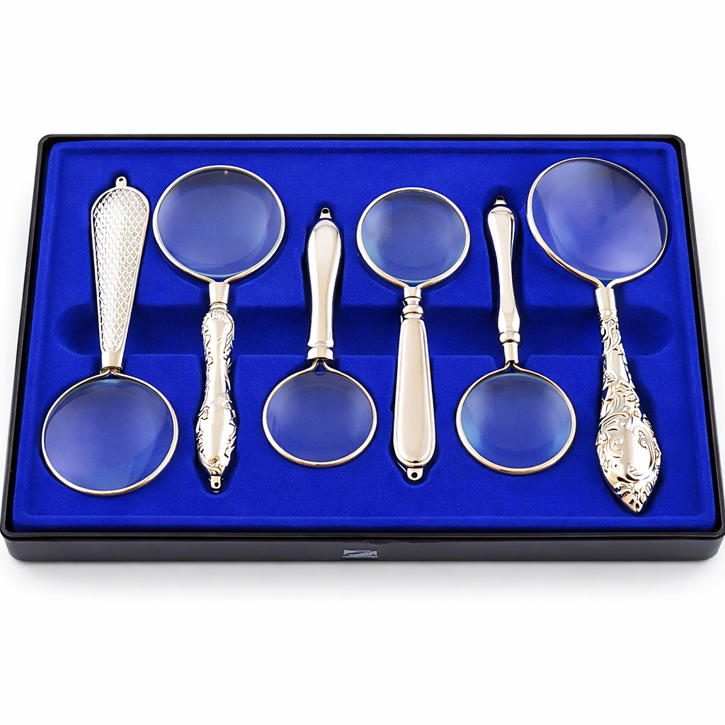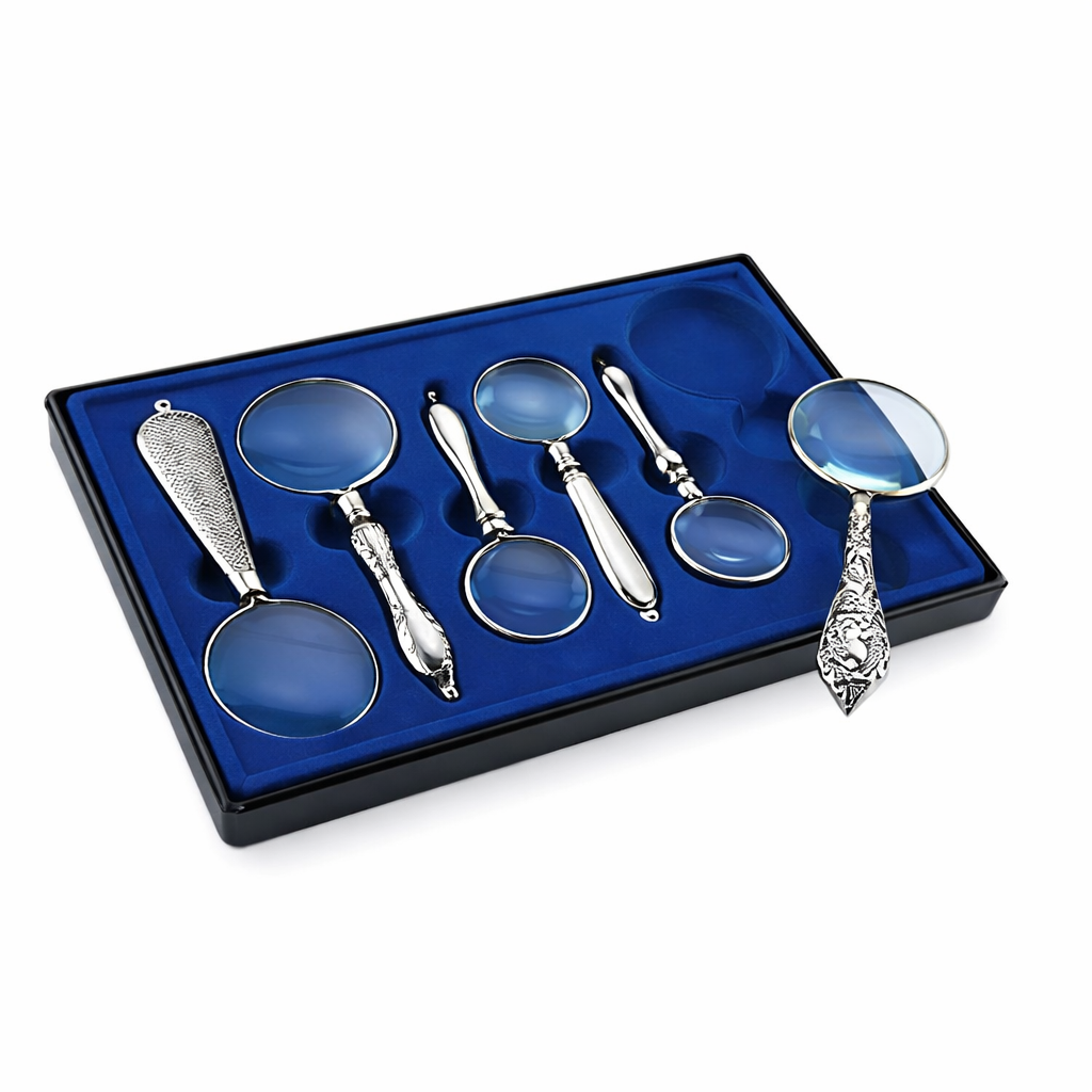 nagyító szett, kézi nagyító, 10X nagyító, olvasó nagyító, ezüst nagyító, retro nagyító, nagyító ajándékba, nagyító készlet 6 db, nagyító gyűjtőknek, üveglencsés nagyító, magnifying glass set