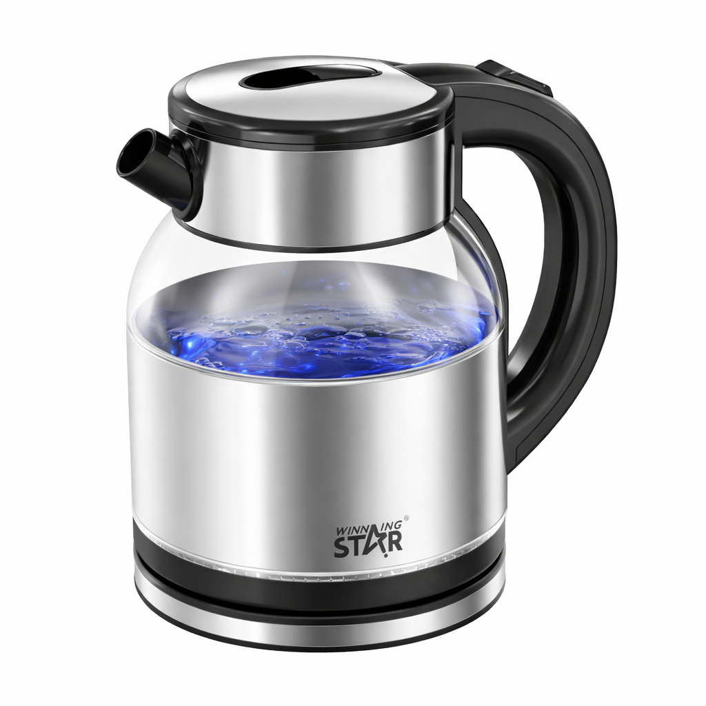 A Winning Star ST-6051 prémium üveg vízforraló modern megjelenésével és praktikus kialakításával tökéletes választás mindennapi használatra. A hőálló üveg és a rozsdamentes acél (inox) kombinációja nemcsak esztétikus, hanem tartós és könnyen tisztítható megoldást is kínál. A beépített LED világítás működés közben kék fénnyel világítja meg a vizet, így a forralás látványos és ellenőrizhető.