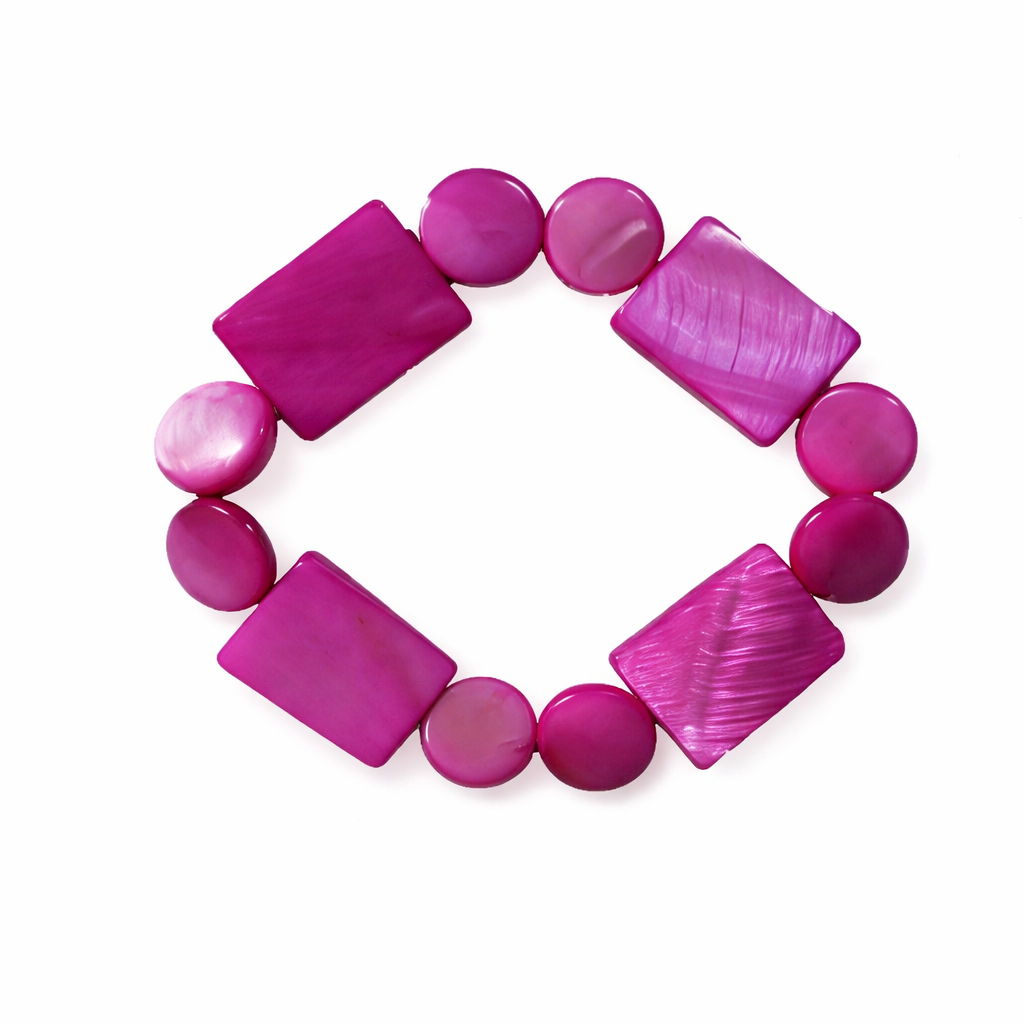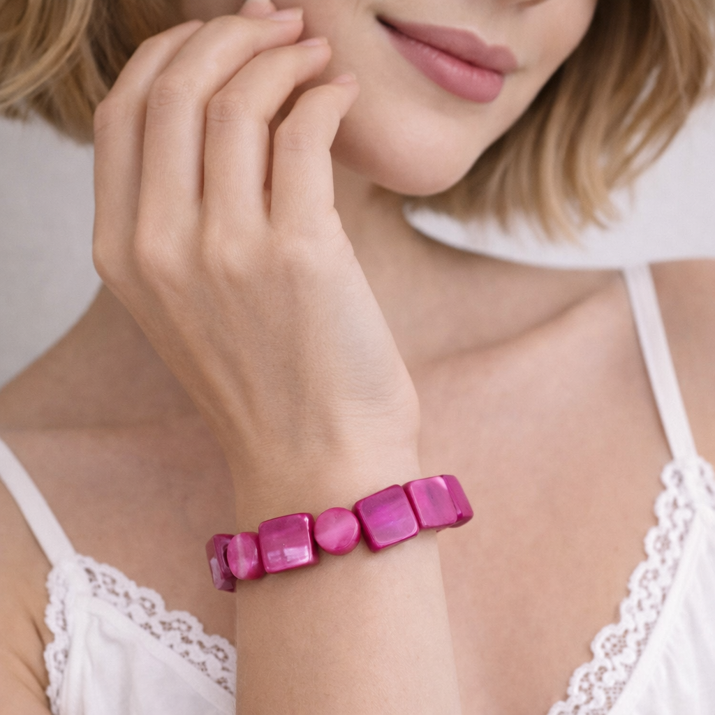 Fukszia gyöngyházfényű gyöngy karkötő kerek és téglalap alakú elemekkel. Rugalmas, kényelmes női ékszer mindennapi viselethez.