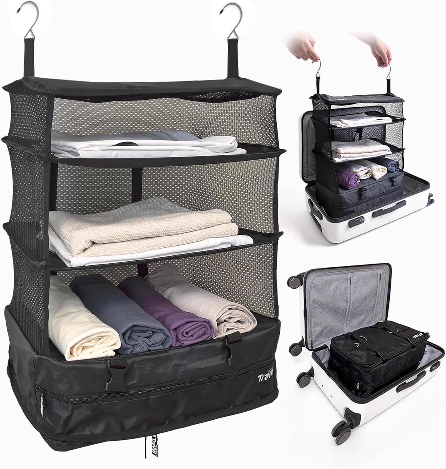 Töltsd fel a ruháiddal, fordítsd bele a táska alsó részébe, majd zárd össze, és máris elfér a bőröndödben! Ha megérkeztél, csak nyisd ki a táskát, fordítsd ki, és a két fogantyú segítségével máris pillanatok alatt beakaszthatod a szekrénybe – vagy ha oda nem tudod, az ajtóra, a karnisra vagy a zuhanyfüggönytartóra! A megoldással utazás közben akár 30 százaléknyi helyet is spórolhatsz, és a ruháid sem lesznek gyűröttek, a ki- és bepakoláskor pedig értékes időhöz jutsz. A táska 20″ és nagyobb méretű bőröndökben fér el.