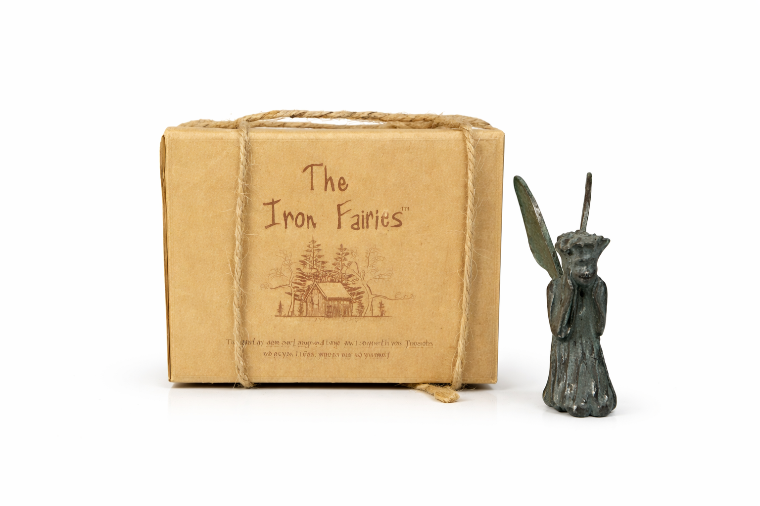 The Iron Fairies” nevű, dekoratív, öntött fém (vas) tündérszobor látható, eredeti díszdobozában. A csomagolás alapján a termék a Wildblue Holdings Pty Ltd (Ausztrália) 2005-ös kiadású design kollekciójához tartozik. A mellékelt német nyelvű vers és a misztikus hangulatú grafika arra utal, hogy ez egy gyűjtői darab, amely egy fantáziavilág koncepciójára épül.