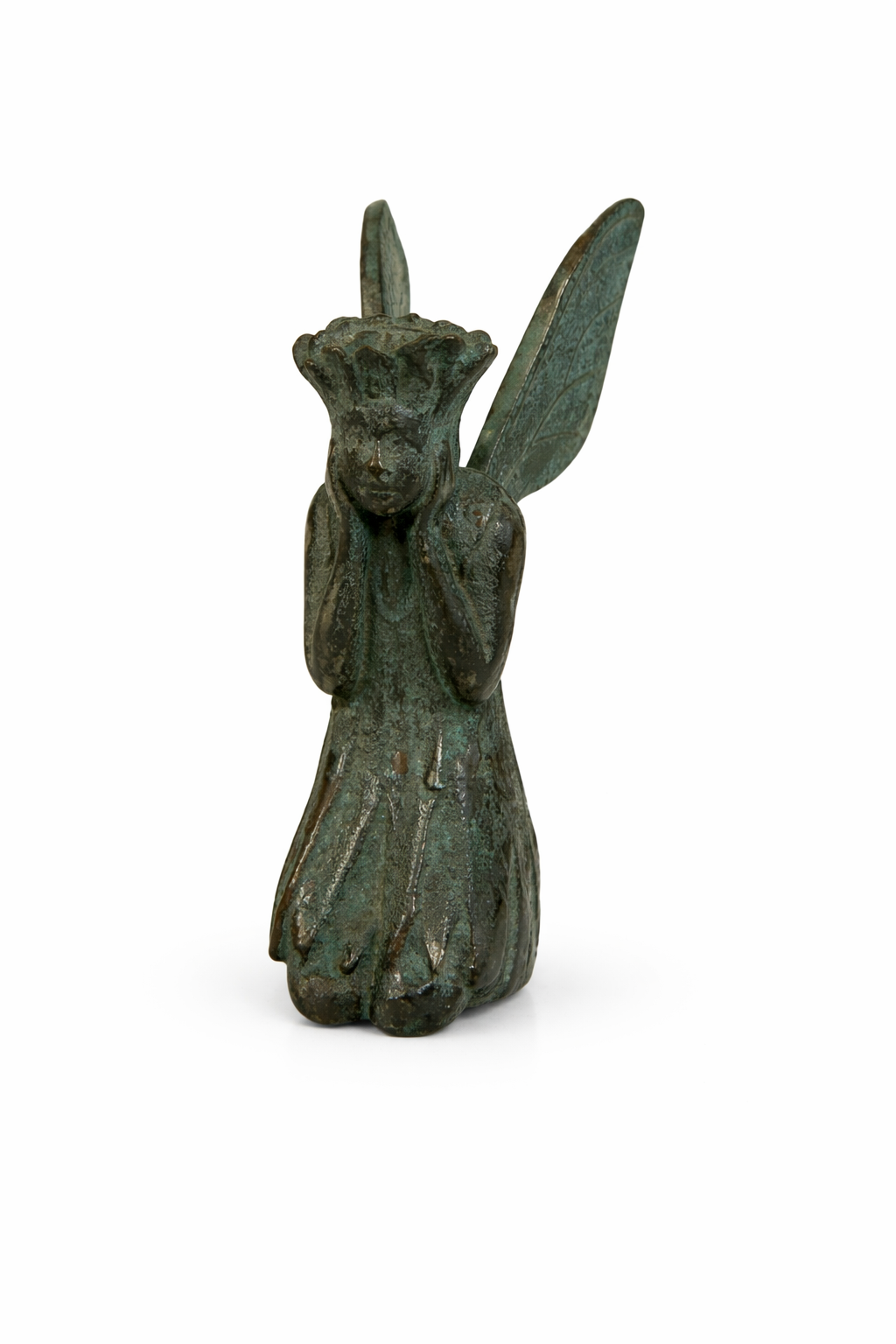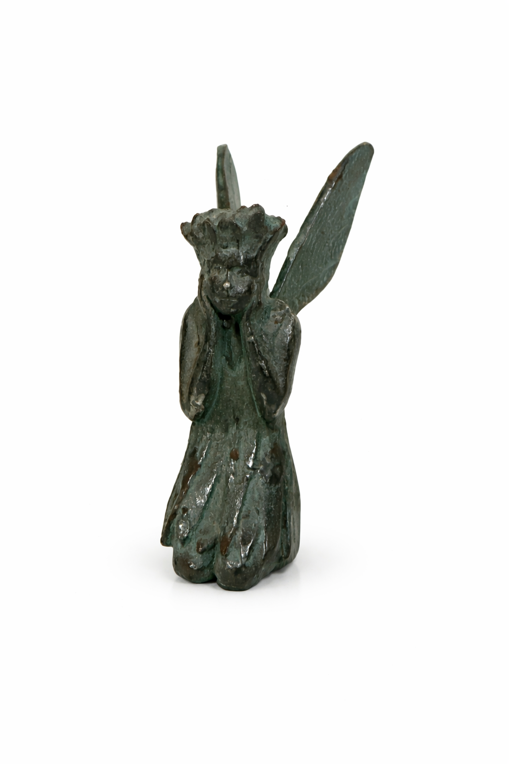 A figura masszív öntöttvasból készült, felületét zöldes, antikolt patina borítja, amely időtálló, kissé régies megjelenést kölcsönöz neki. A tündér kecses testtartással, arcát kezei közé támasztva, finoman kidolgozott ruharedőkkel és részletgazdag szárnyakkal jelenik meg. A texturált felület és az aprólékos mintázat különleges karaktert ad a figurának.