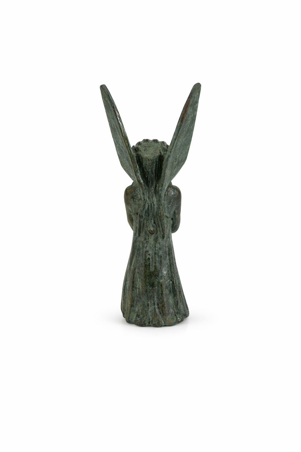 A szobor egy finoman kidolgozott, ülő pózban ábrázolt tündért jelenít meg, hosszú, kecses szárnyakkal. Testtartása visszafogott, enyhén befelé forduló, ami melankolikus, titokzatos hangulatot kölcsönöz neki. A felület kékes-zöldes oxidált patinát kapott, amely az idő múlását és a föld alatti világ atmoszféráját idézi.