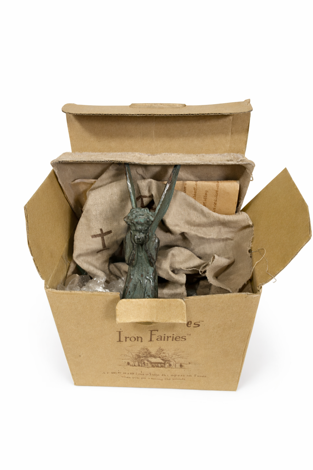 Öntöttvas tündér dísz – „Iron Fairies” ajándékdobozos kivitel , A termék natúr kartondobozban érkezik, amely belül textil betéttel és dekoratív kiegészítőkkel van ellátva. Ez nemcsak védi a figurát szállítás közben, hanem ajándékozásra is alkalmassá teszi. A rusztikus csomagolás tökéletesen illeszkedik a termék stílusához, így már a kibontás élménye is különleges.