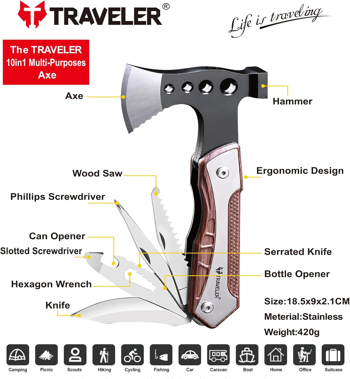 A Traveler multifunkciós balta tökéletes társ a szabadban és a mindennapokban – megbízható, erős és sokoldalú eszköz minden kihíváshoz.