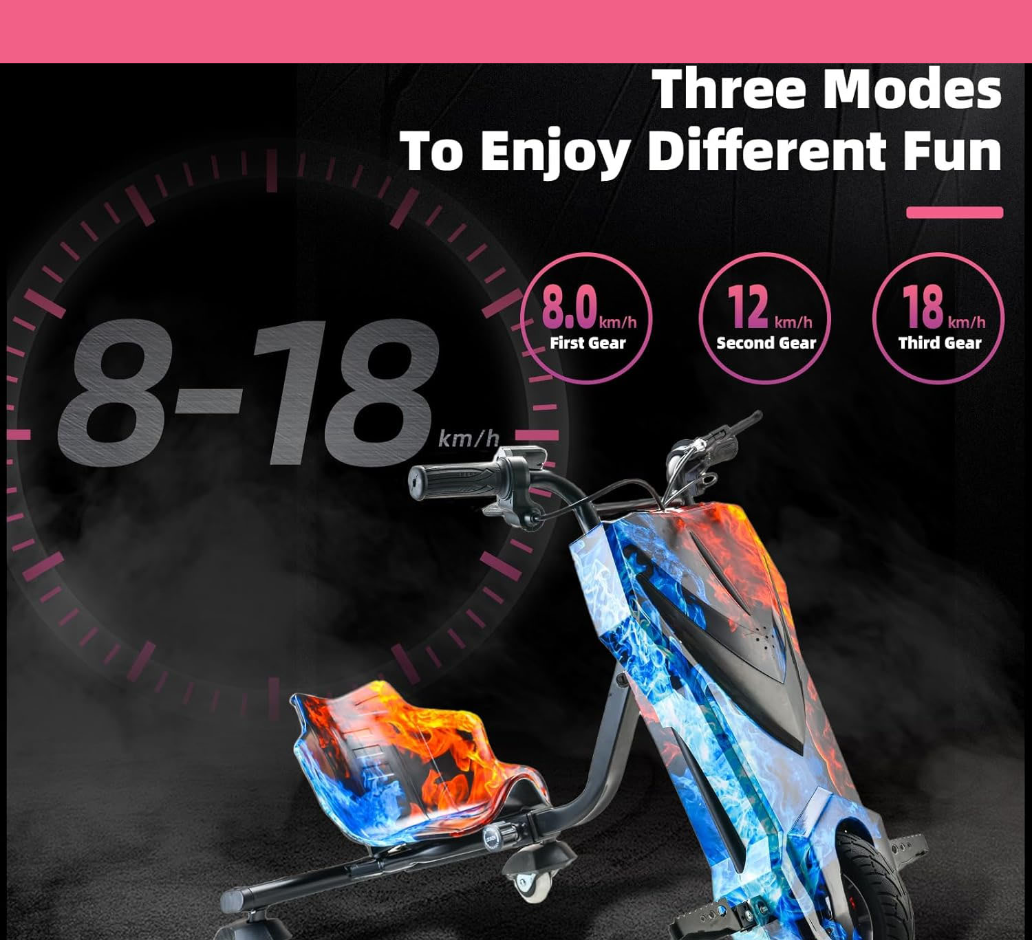HÁROMKEREKŰ SZÓRAKOZÁS: Az elektromos drift tricikli egy egyedülálló, háromkerekű jármű, amelyet izgalmas és oldalirányú sodródásokhoz terveztek, ötvözve a drift izgalmát a tricikli stabilitásával.