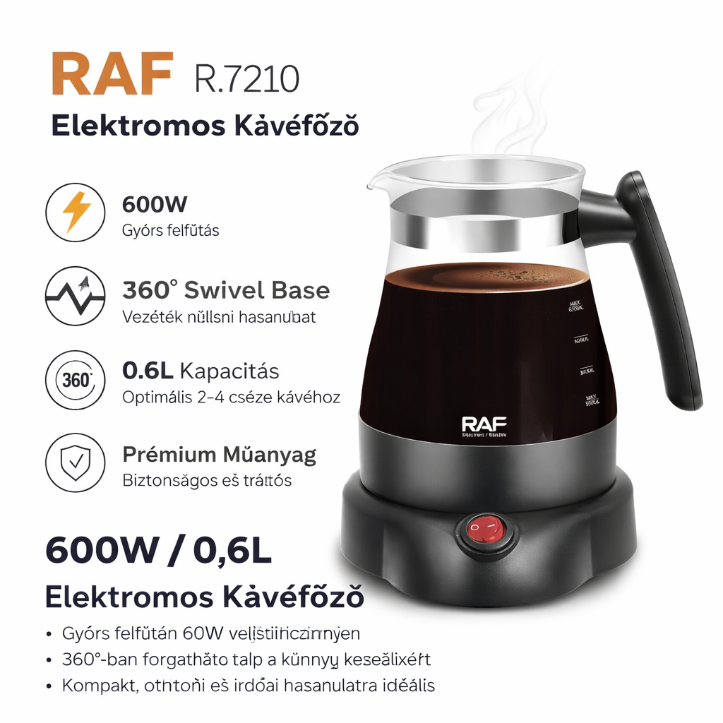 RAF R.7210 Elektromos Kávéfőző 600W – 0,6L Kompakt Kávéfőző 360° Talppal
