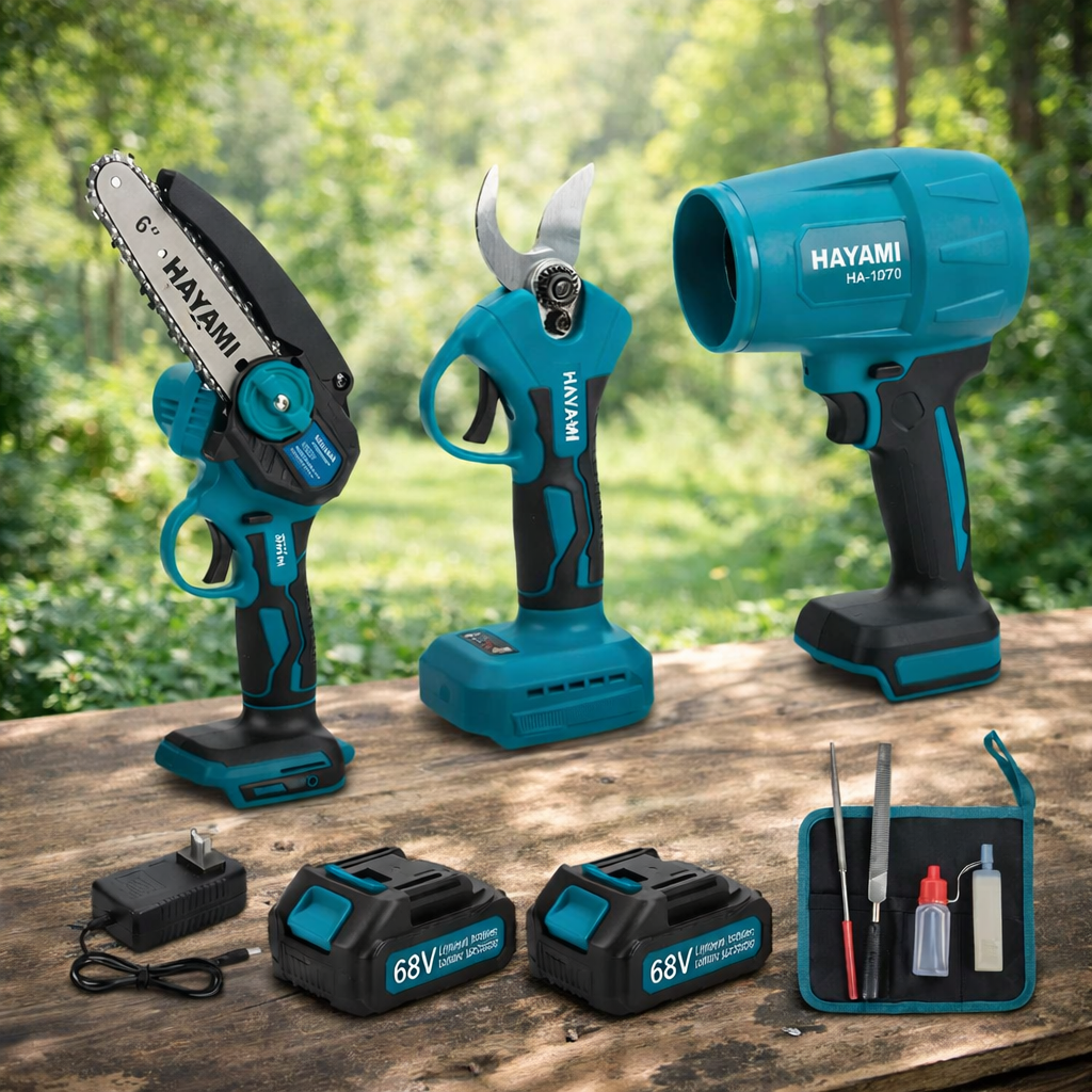 HAYAMI HA-1070 3 az 1-ben akkumulátoros kerti szerszámkészlet 68V rendszerrel. Mini láncfűrész, metszőolló és lombfúvó egy szettben.
