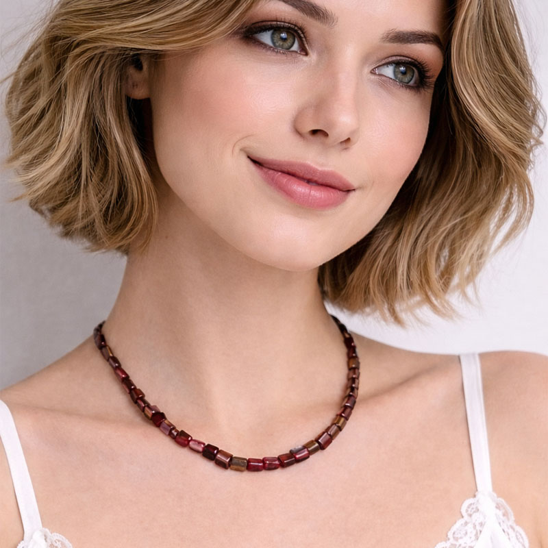 Elegáns bordó–barna gyöngyös nyaklánc természetes hatású kocka gyöngyökkel. Stílusos női ékszer mindennapi és alkalmi viselethez.