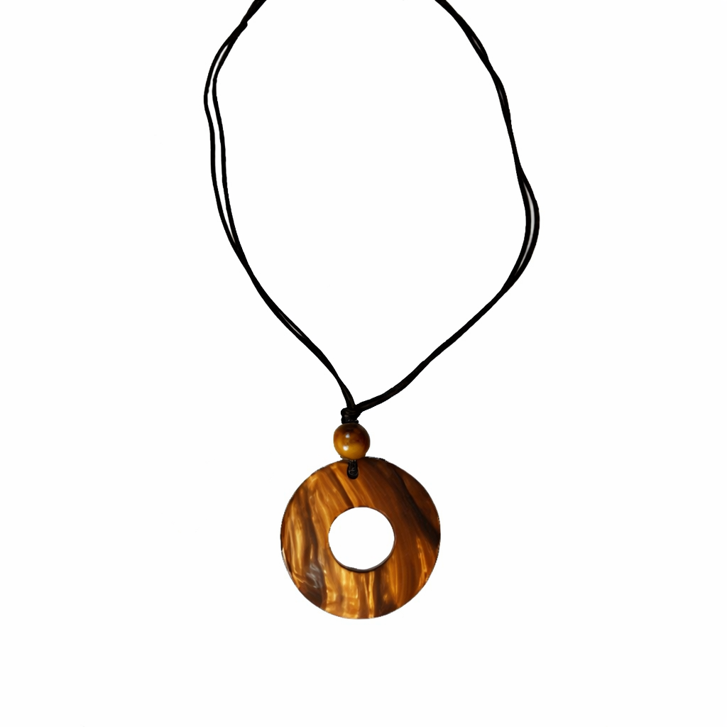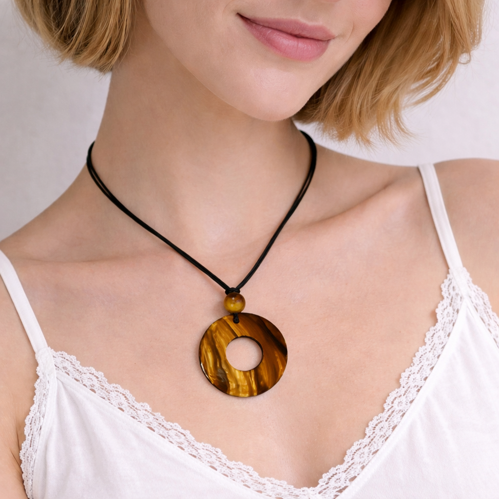 Ez a tigrisszem hatású donut medálos nyaklánc természetes eleganciát és különleges karaktert sugároz. A kör alakú, középen áttört medál klasszikus szimbólum, amely az egyensúlyt és a harmóniát jelképezi. A meleg barna–arany árnyalatok finoman hullámzó mintázata minden darabot egyedivé tesz, így nincs két teljesen egyforma nyaklánc.