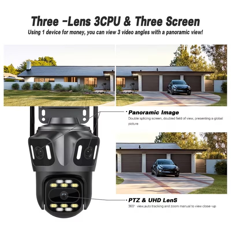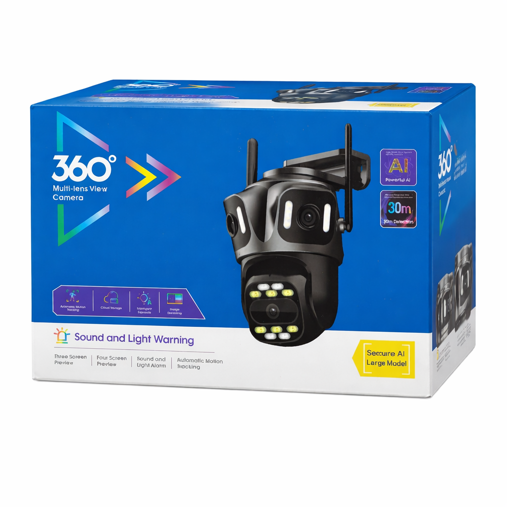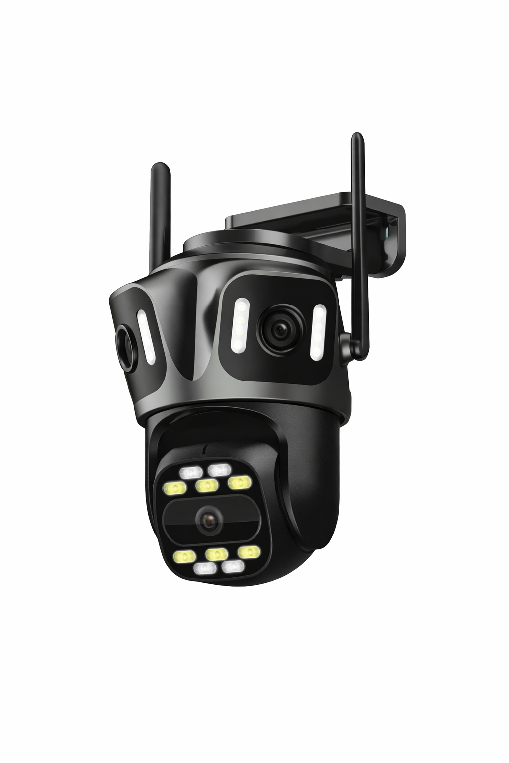 Védd otthonod, üzleted vagy telephelyed egy modern, intelligens 360°-os kültéri biztonsági kamerával! A több lencsés kialakításnak és a PTZ (forgatható-dönthető) funkciónak köszönhetően teljes körű megfigyelést biztosít vakfoltok nélkül.