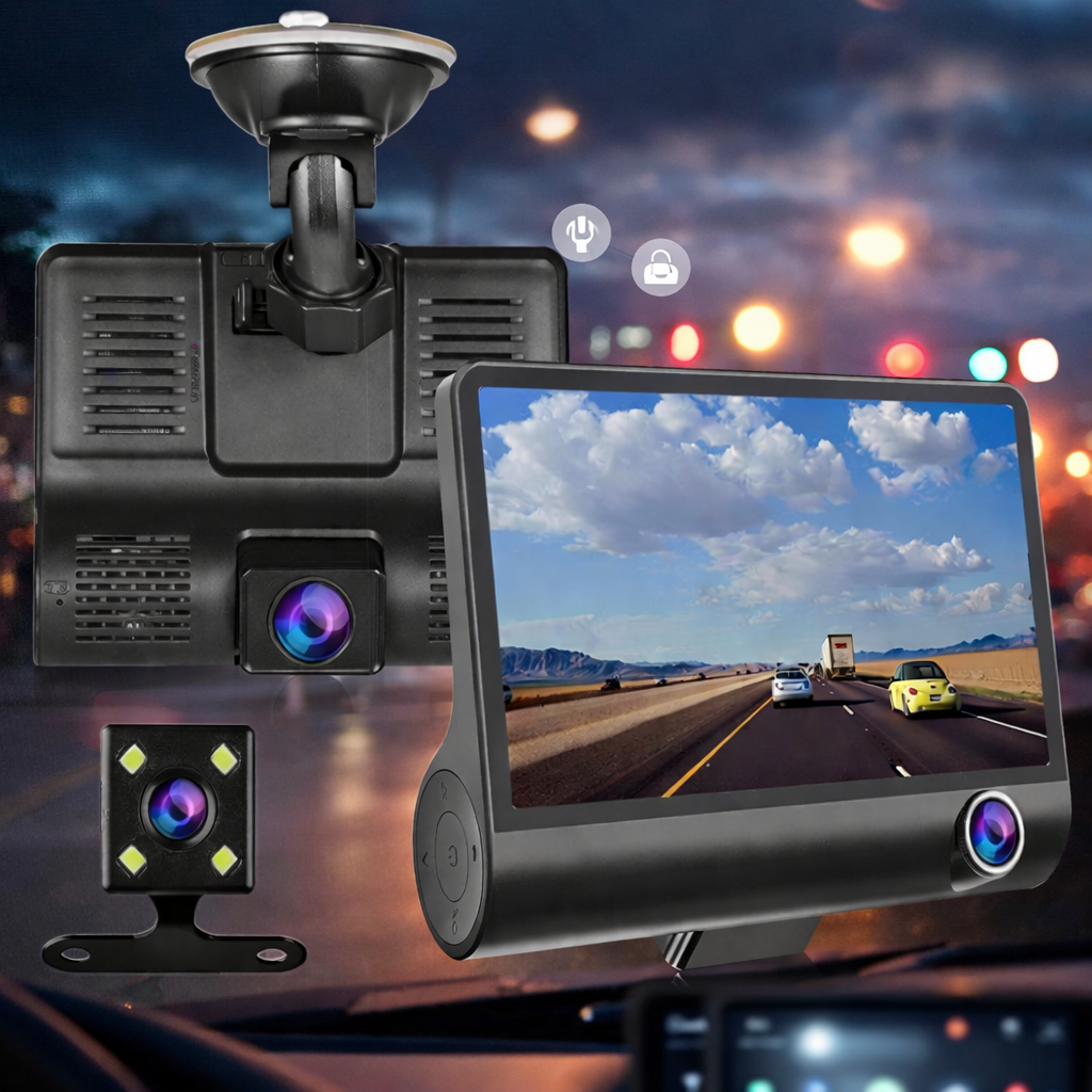 Rögzítsen minden fontos pillanatot vezetés közben ezzel a 3 kamerás autós eseményrögzítő rendszerrel, amely elöl, belül és hátul is figyeli a jármű környezetét. A Full HD 1080P felbontás, az éjszakai HDR mód és a parkoló funkció gondoskodik arról, hogy minden helyzetben tiszta és részletgazdag felvételek készüljenek.