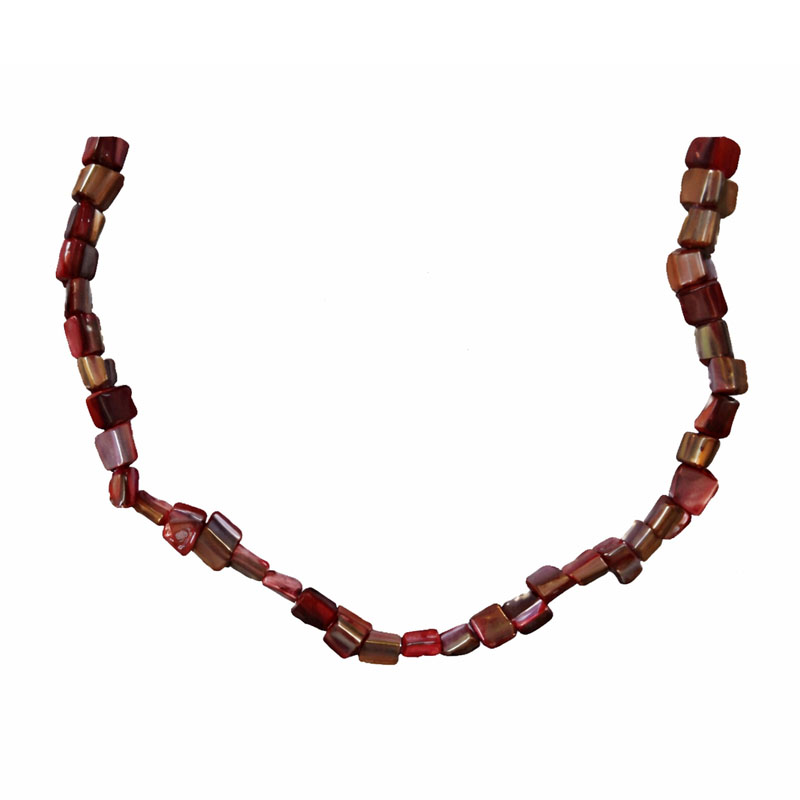 Ez a különleges gyöngyös nyaklánc természetes eleganciát és finom nőiességet sugároz. A szabálytalan formájú, kocka alakú gyöngyök meleg bordó–barna árnyalatokban játszanak, finom gyöngyházfénnyel, amely minden fényben más-más tónust mutat. Az egyedi formák és színek harmonikus összhangja igazán karakteres, mégis letisztult megjelenést eredményez.
