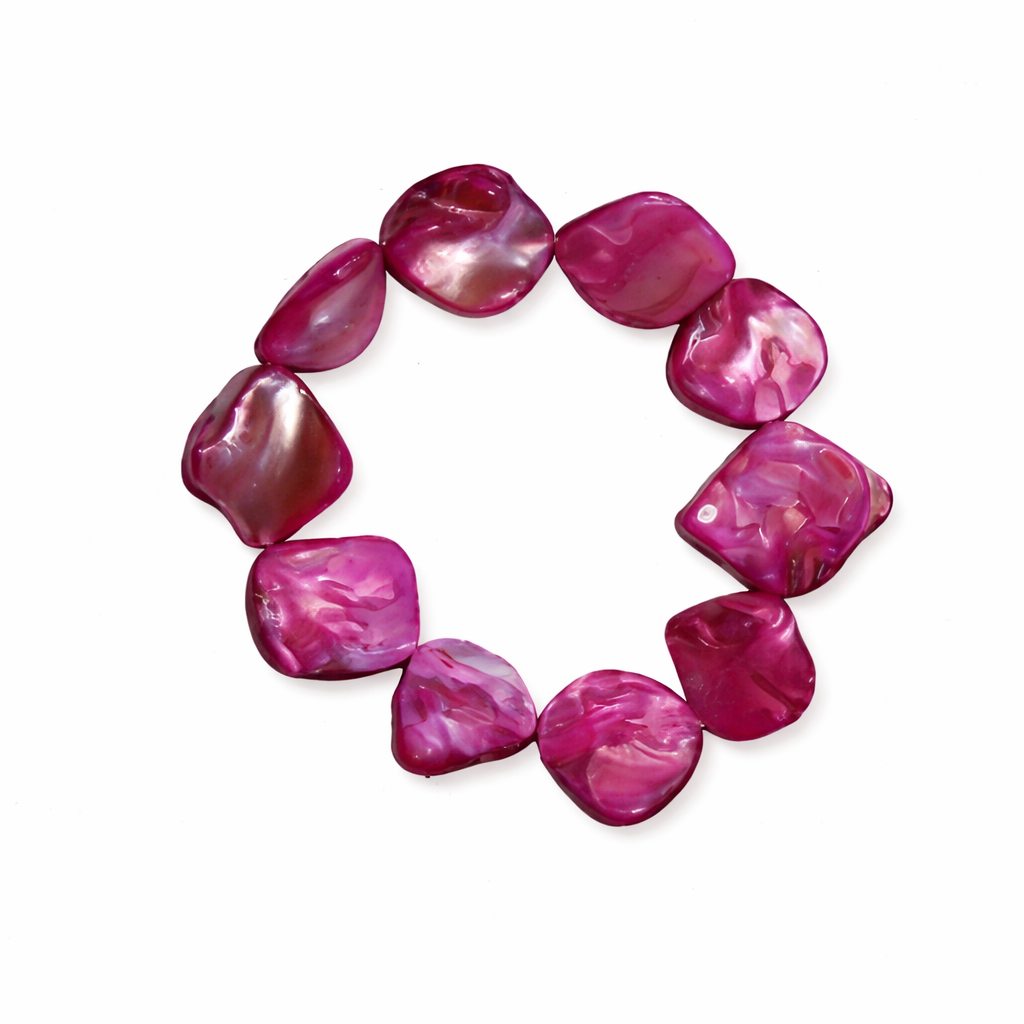 Fukszia színű gyöngyház karkötő szabálytalan formájú gyöngyökkel. Rugalmas, kényelmes és látványos női ékszer mindennapi viselethez.