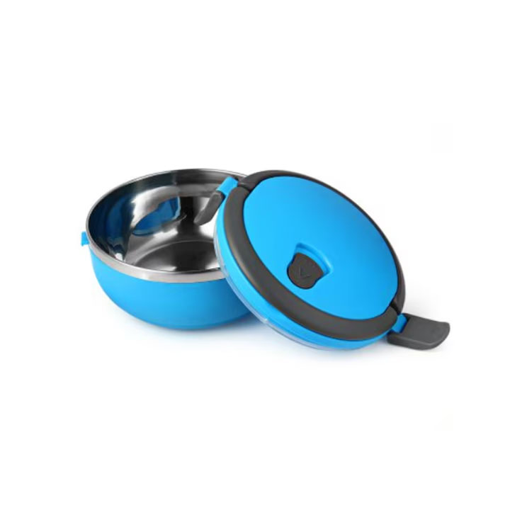 A tároló kívül kemény műanyagból, belül rozsdamentes acélból készült, így a hőt is tovább tartja, mint hagyományos társai. A tető szilikon pereme tökéletes záródást biztosít, hogy ne lötyögjön ki semmi útközben. Kétoldalt m?anyag, pattintós füllel zárható, hordozófüleivel pedig kényelmesen magaddal viheted bárhova.