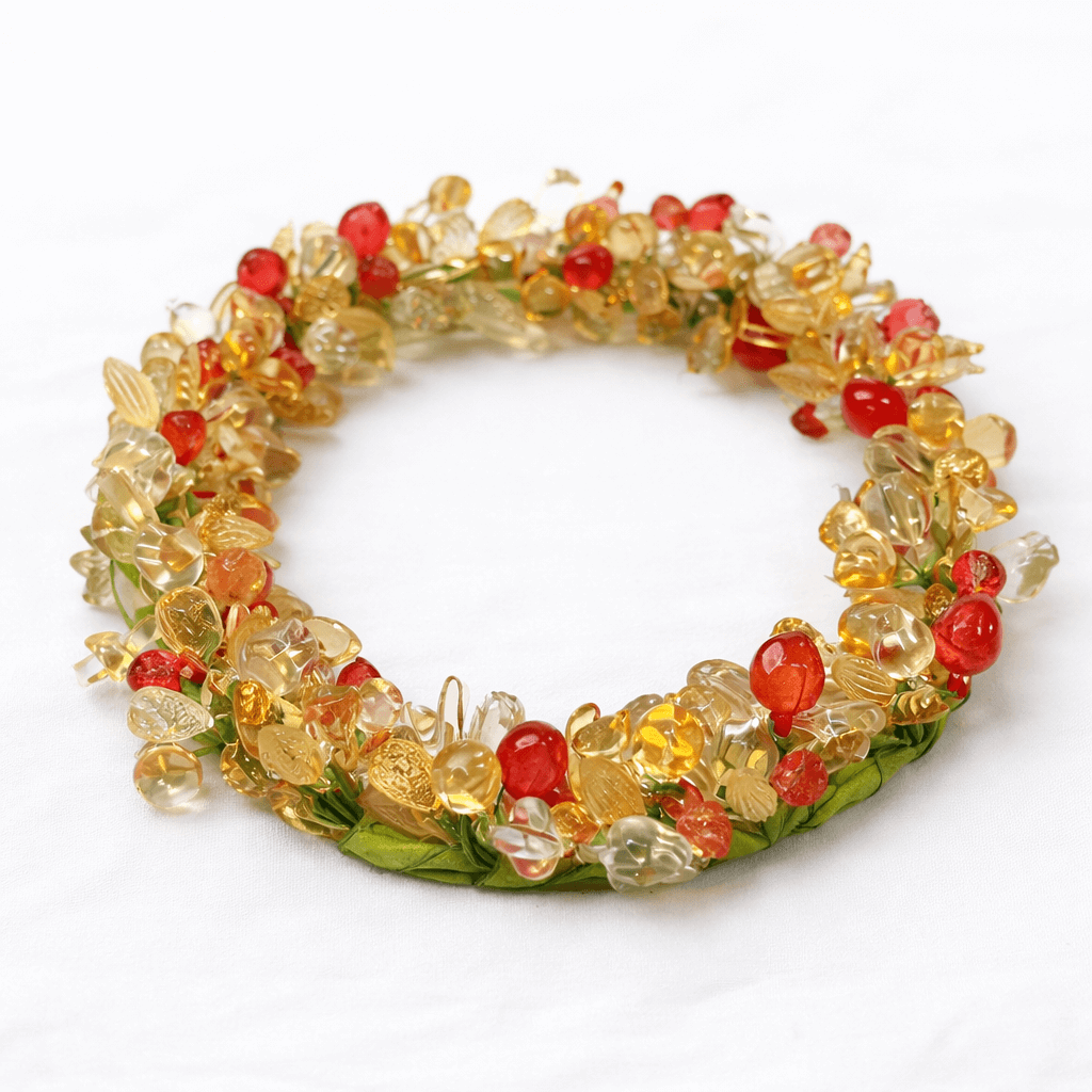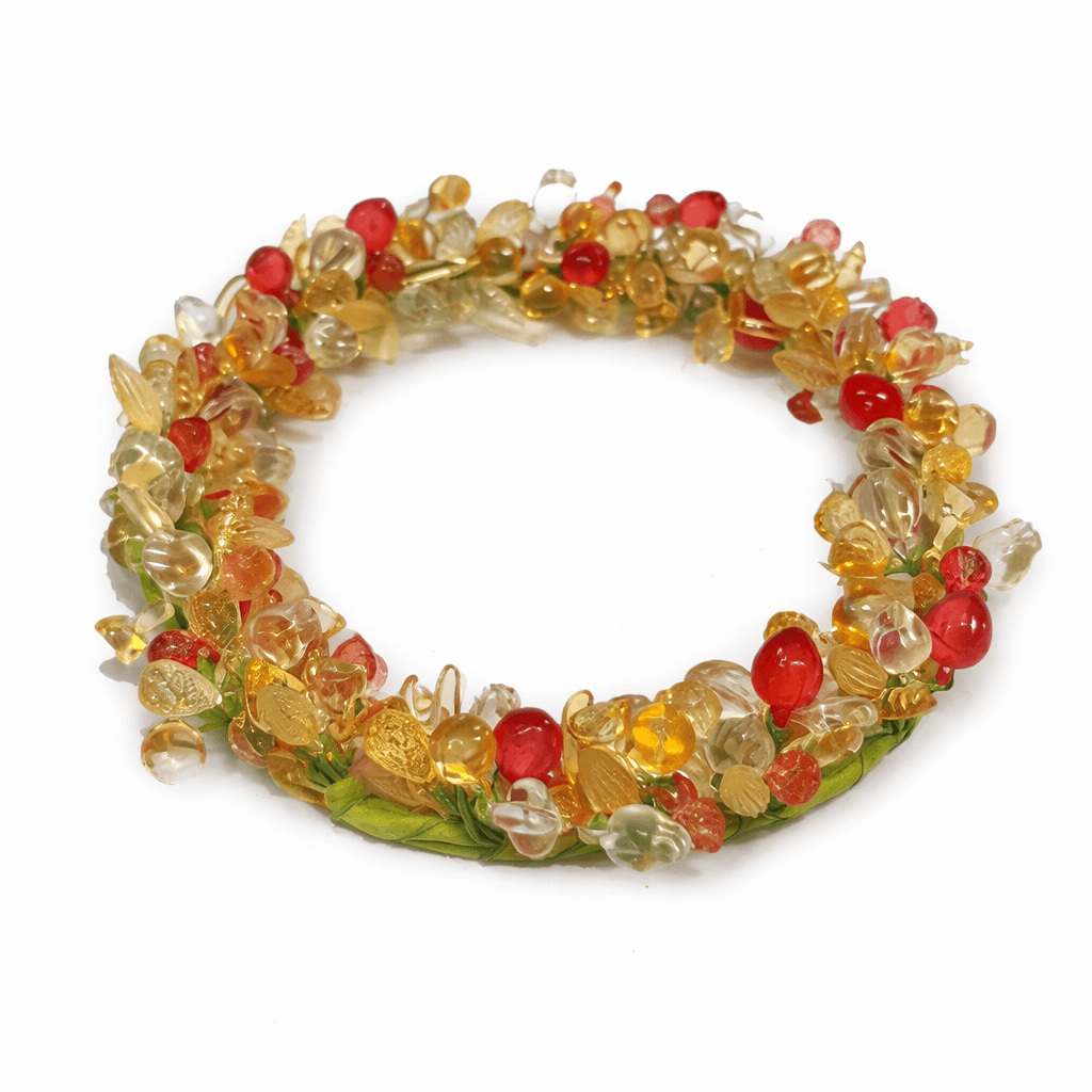 A dekoráció alapját stabil, kör alakú forma adja, amelyet változatos méretű és formájú gyöngyök borítanak. A fényben finoman csillogó elemek elegáns, mégis játékos megjelenést biztosítanak, így modern, klasszikus vagy akár bohém stílusú enteriőrbe is könnyedén beilleszthető.